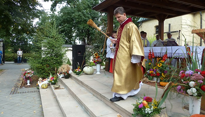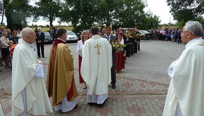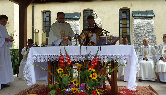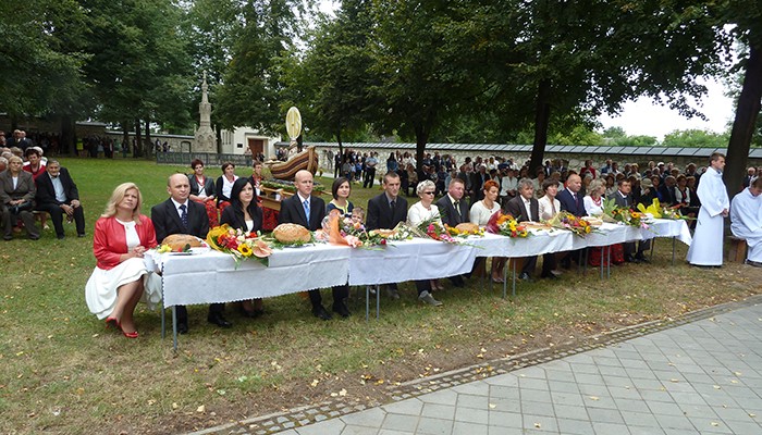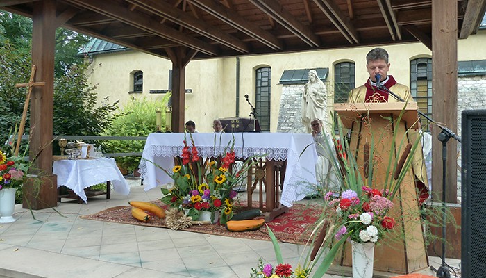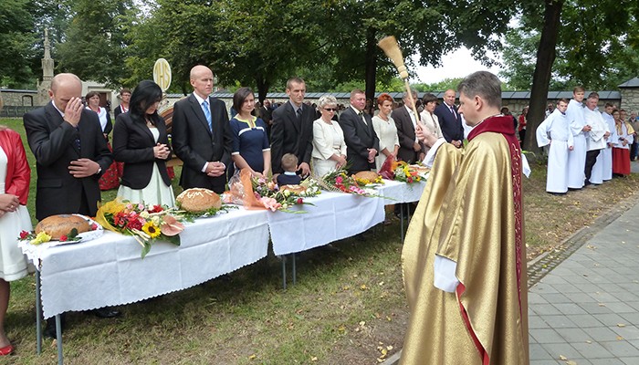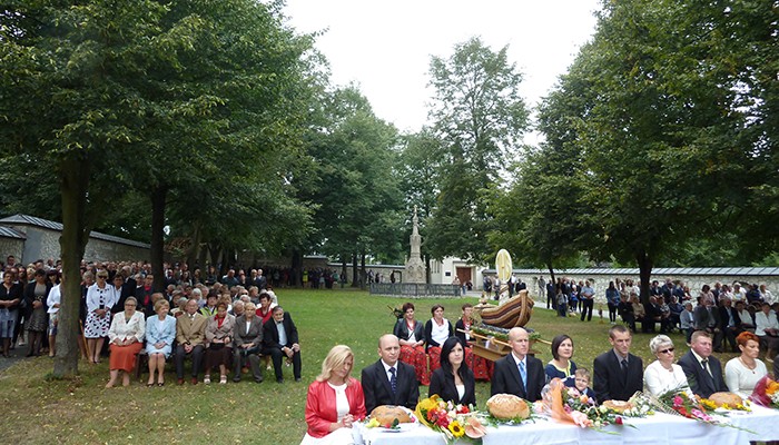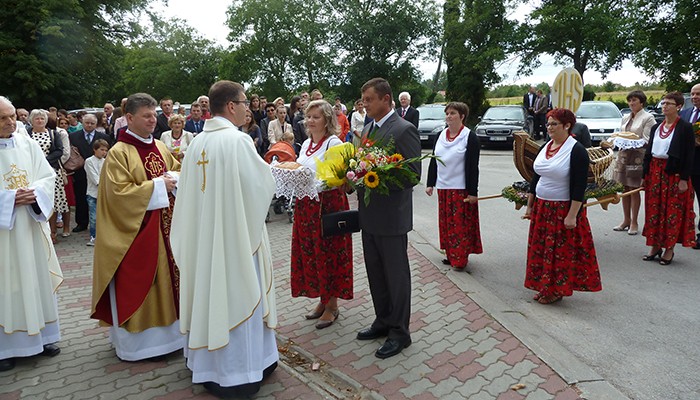 Mieszkańcy miejscowości wchodzących w skład naszej parafii przygotowali piękny wieniec dożynkowy symbolizujący Kościół jako łódź płynącą po wzburzonych wodach świata do portu zbawienia. Ofiarowali także dziękczynne chleby. Po Mszy świętej wszyscy przenieśli się na tereny klasztorne, aby przy dźwiękach muzyki zakosztować przepysznych wypieków, sporządzonych przez mieszkańców poszczególnych wiosek.